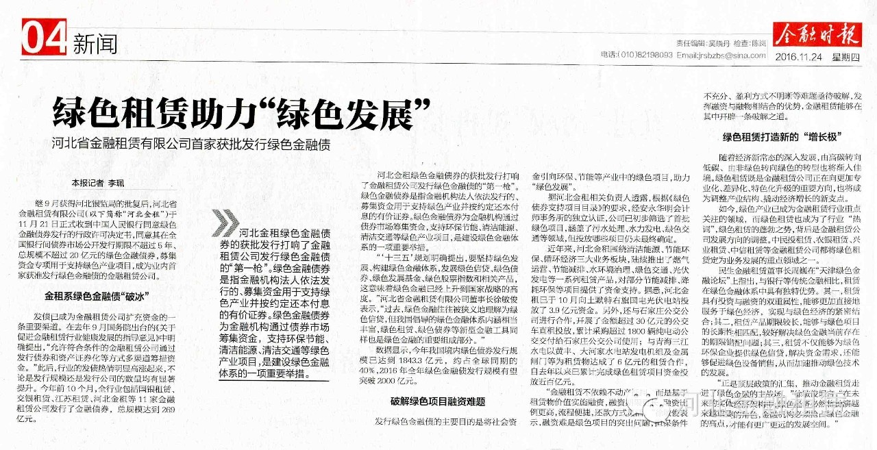 繼9月獲得河北銀監(jiān)局的批復(fù)后,河北省金融租賃有限公司(以下簡(jiǎn)稱(chēng)“河北金租”)于11月21日正式收到中國(guó)人民銀行同意綠色金融債券發(fā)行的行政許可決定書(shū),同意其在全國(guó)銀行間債券市場(chǎng)公開(kāi)發(fā)行期限不超過(guò)5年、總規(guī)模不超過(guò)20億元的綠色金融債券,募集資金專(zhuān)項(xiàng)用于支持綠色產(chǎn)業(yè)項(xiàng)目,成為業(yè)內(nèi)首家獲準(zhǔn)發(fā)行綠色金融債的金融租賃公司。