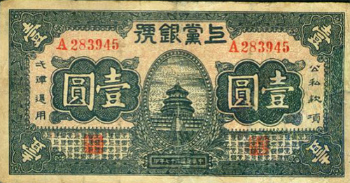 1938年,為了獨(dú)立自主地發(fā)展和鞏固根據(jù)地,嚴(yán)防蔣介石、閻錫山經(jīng)濟(jì)封鎖,晉東南抗日根據(jù)地在沁縣成立上黨銀號,發(fā)行“上黨票”。上黨票初發(fā)行時與法幣、晉鈔、銀元以及根據(jù)地各縣銀號發(fā)行的縣票同時流通于晉東南、晉南、晉中、冀南等部分縣域,1938年發(fā)行的面額有拾元、伍元、貳元、壹元、伍角、貳角伍分、貳角、壹角等8種票面10種版別。壹元票的主圖設(shè)計為體現(xiàn)根據(jù)地貨幣特色,天壇主圖的下面倒印有一“黨”字暗記。1940年初,“上黨銀號”結(jié)束,其財產(chǎn)并入“冀南銀行”時,共發(fā)行上黨票300余萬元。