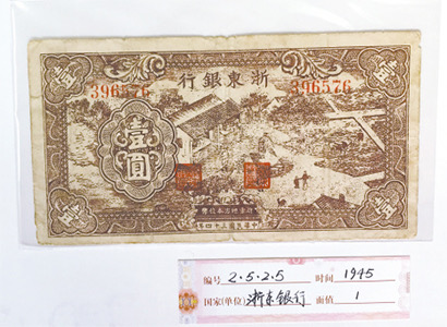 1945年4月1日,浙東銀行在浙江余姚成立,發(fā)行了18種36式浙東銀行幣。浙東銀行紙幣每元折合大米一市斤,不會貶值,在浙東人民群眾中享有很高的信譽(yù)。