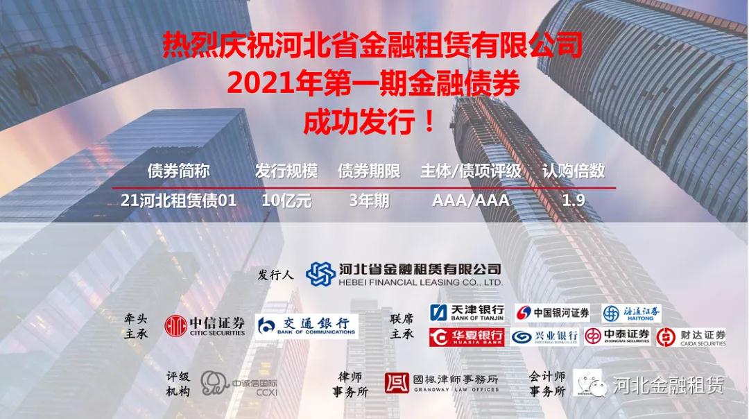 日前,河北省金融租賃有限公司(以下簡稱“河北金租”或“公司”)成功發(fā)行2021年第一期金融債券,本期債券由中信證券和交通銀行為牽頭主承銷商,獲得了各家金融機構的積極認購,發(fā)行規(guī)模10億元,期限3年。此次債券的圓滿發(fā)行進一步在市場樹立了河北金租穩(wěn)健進取、持續(xù)發(fā)展的形象。