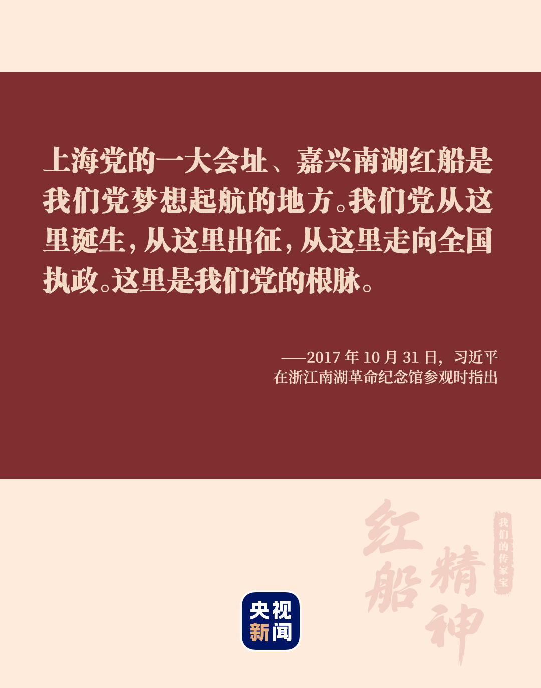 “小小紅船承載千鈞,播下了中國(guó)革命的火種,開(kāi)啟了中國(guó)共產(chǎn)黨的跨世紀(jì)航程?!?017年10月31日,黨的十九大勝利閉幕僅一周,習(xí)近平總書(shū)記帶領(lǐng)中共中央政治局常委專程趕赴嘉興南湖瞻仰紅船。
